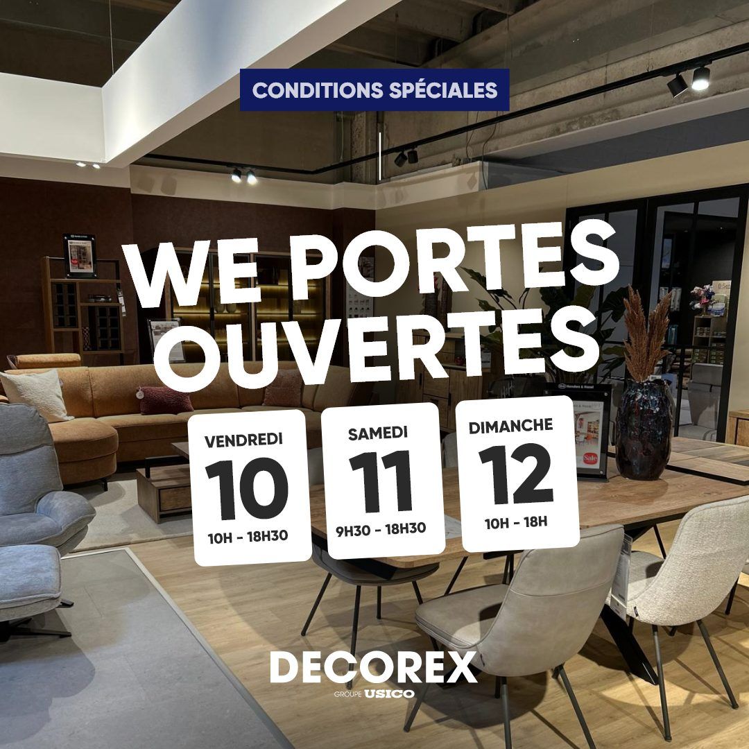DECOREX à Nivelles est ouvert du lundi au vendredi de 10h à 18h30 et le samedi de 9h30 à 18h30! USICO Anderlues, Chatelineau et Namur sont ouverts du mardi au vendredi de 10h à 18h30 et le samedi de 9h30 à 18h30 (les magasins USICO sont fermés le lundi !).